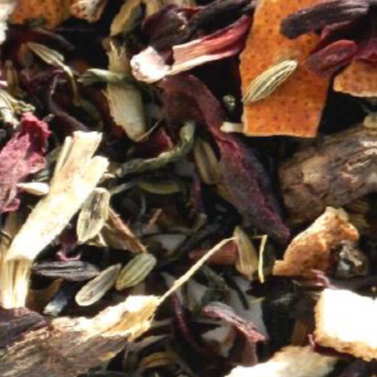Zutaten: Hibiskus, grüner Tee, Orangenstücke, Fenchelsamen, Anissamen, Zimt, Süßholzwurzel