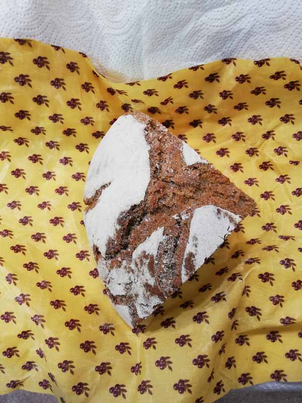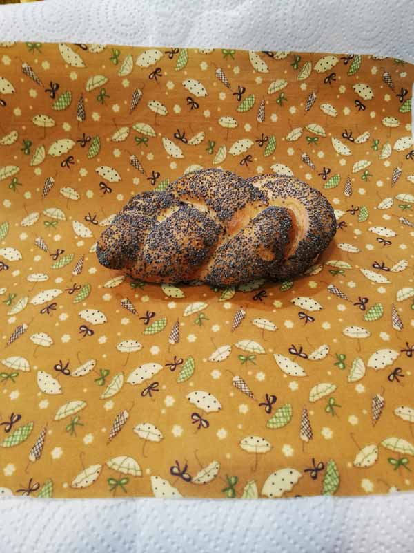 Frisches Brot direkt vom Bäcker hat noch viel Feuchtigkeit in sich. Da reicht es vorerst die Anschnittfläche abzudecken. Je trockener das Brot wird, desto dichter kannst Du es einpacken. Gebäck & Weissbrot aller anderen Arten sollt ganz mit dem Bienenwachstuch umhüllt werden.