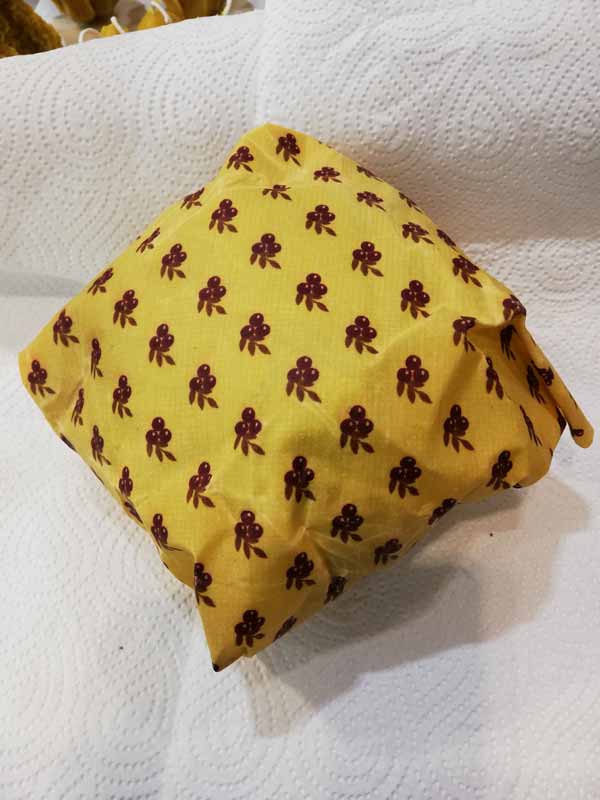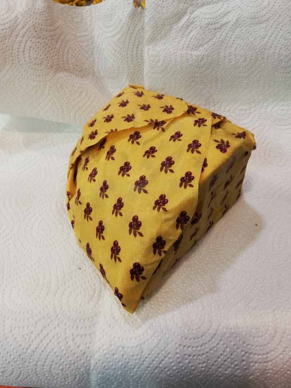 ▪️ Bienenwachstuch zusammenknüllen / kneten und zwischen den Händen erwärmen dann gewünschtes Lebensmittel verpacken